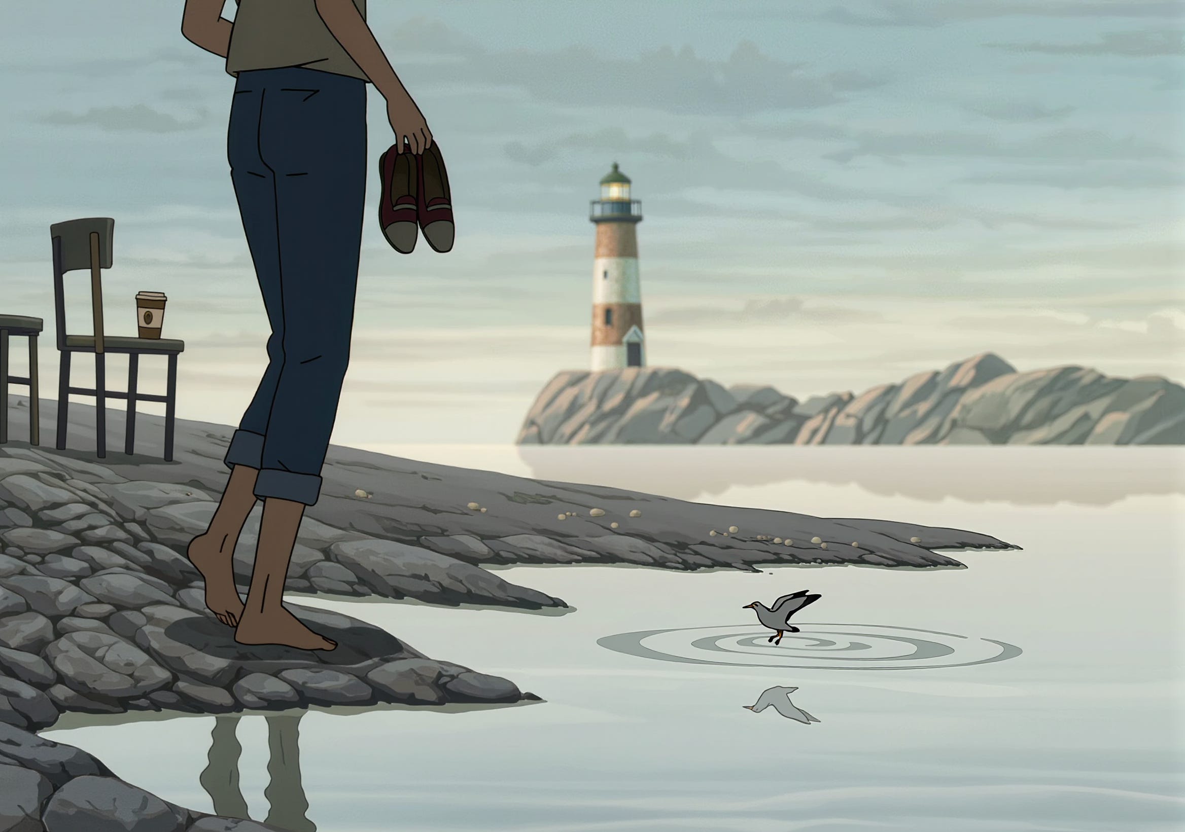 Sea and sky are gray, the sun too low to show hints of blue, and the surface perfectly flat, a clean canvas reflecting the lighthouse a few meters from the shore. Perched on the railings, a couple of seagulls track the water with hungry focus, and a woman in a bright green swimming cap and a one-piece swimsuit slips in, breaking the stillness and sending ripples around her body. A few strong strokes, and she’s gone.